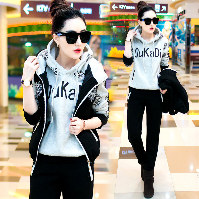 2015冬裝新款大碼女裝 韓版印花衛(wèi)衣三件套加厚加絨運動休閑套裝 /