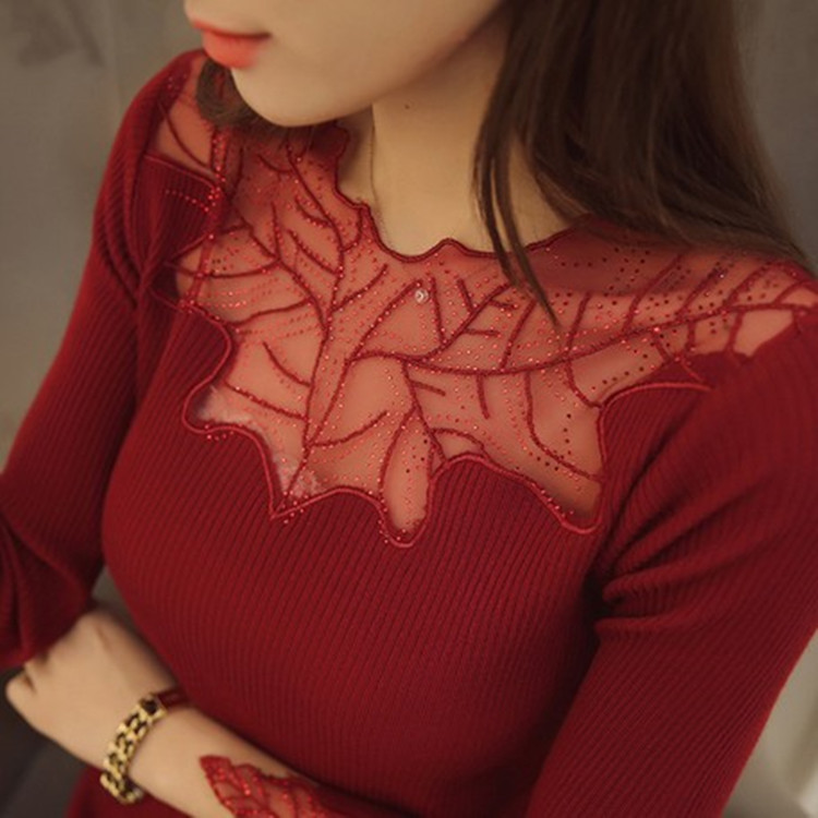 2015冬季韓版加厚保暖新款秋葉蕾絲打底衫針織毛衣修身潮外套女裝 /