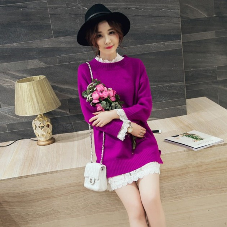 2015冬裝新款韓版純色百搭柔軟長款寬松套頭毛衣加蕾絲裙子兩件套 /