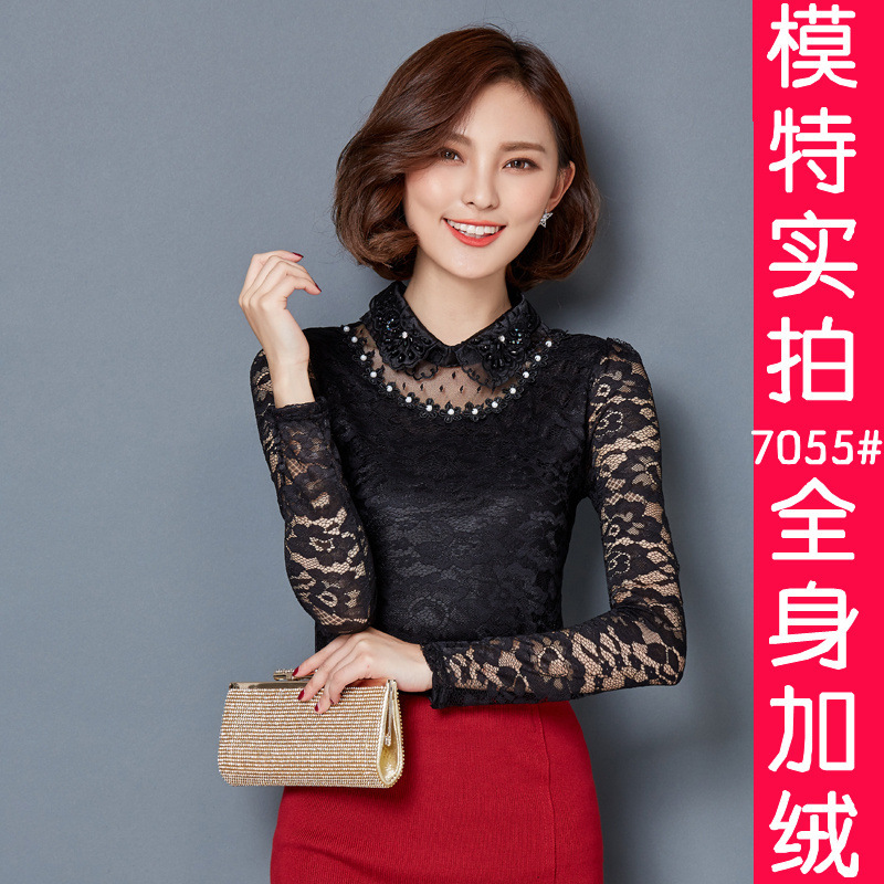 實(shí)拍2015秋冬裝娃娃領(lǐng)加絨加厚保暖打底衫 修身OL蕾絲衫 /