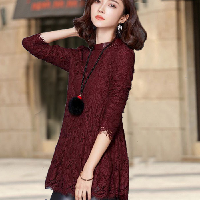 秋裝新款貂絨蕾絲打底衫中長款 圓領(lǐng)套頭修身女裝上衣 蕾絲 /