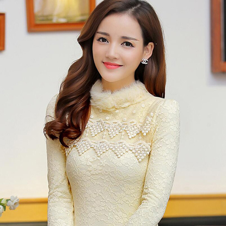 2015秋冬季韓版加絨加厚打底衫上衣女裝大碼保暖兔毛領(lǐng)燙鉆蕾絲衫 /