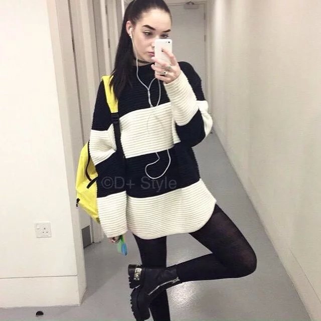 2015秋冬新品 歐美大牌時尚寬松黑白撞色半高領中長款毛衣 /