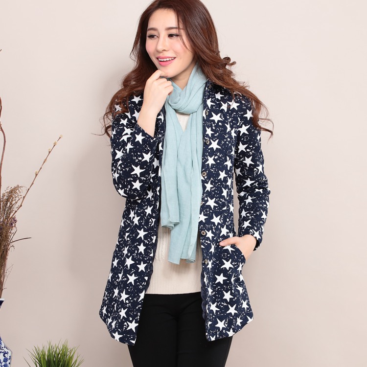 秋冬裝薄棉衣女修身顯瘦中長款棉服棉襖星星圖案夾棉外套D1011 /