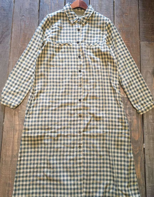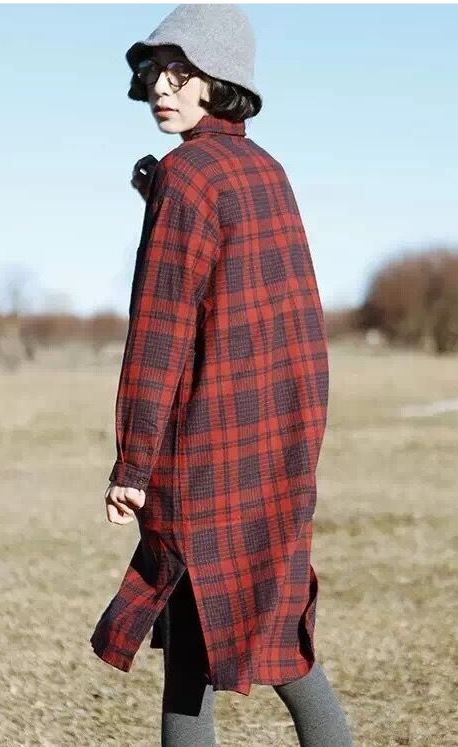B009 16早春新款外貿(mào)文藝全棉磨毛格紋中長(zhǎng)款襯衫 襯衣 /