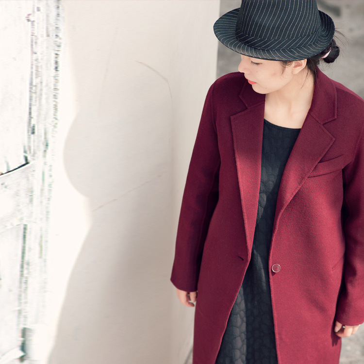 法國高端外貿(mào)小繭型羊毛呢中長款大衣女酒紅色手工雙面呢外套簡約 /
