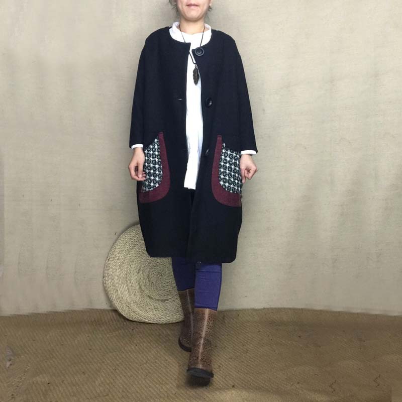 15冬季新款 原創(chuàng)設計寬松拼接大口袋外套 時尚不對稱毛呢女 /