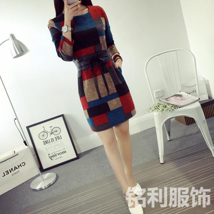 2015秋冬新款歐洲站女裝長袖格子羊毛連衣裙短裙修身毛呢打底裙女 /