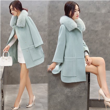 2015冬裝新款韓版毛呢外套女中長款修身狐貍大毛領羊絨毛呢子大衣 /