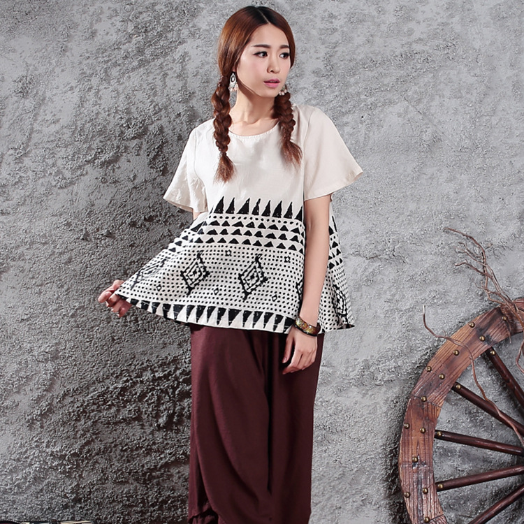 森女系列女士幾何印花T恤短袖棉麻女上衣夏款套頭寬松型圓領T恤 /