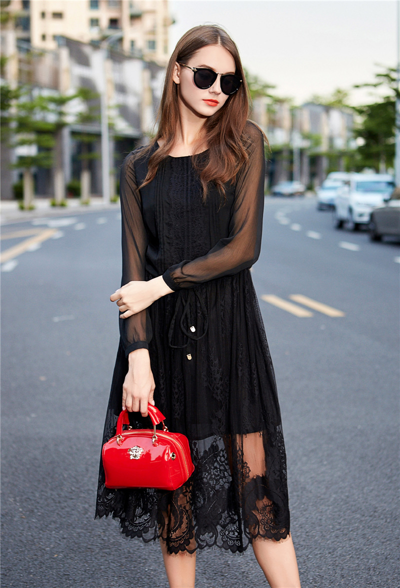 歐洲站2015新款女裝歐美時尚七分袖中長款蕾修身絲連衣裙廠家直銷 /
