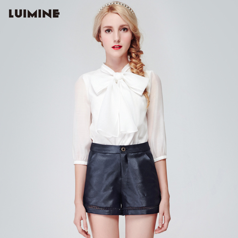 2015新款韓版女裝七分泡泡袖歐根紗大蝴蝶結(jié)雪紡上衣雪紡衫 女 /