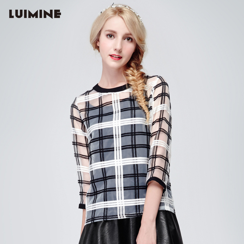 2015新款歐美九分袖歐根紗黑白格子上衣套頭中長款寬松雪紡衫 女 /