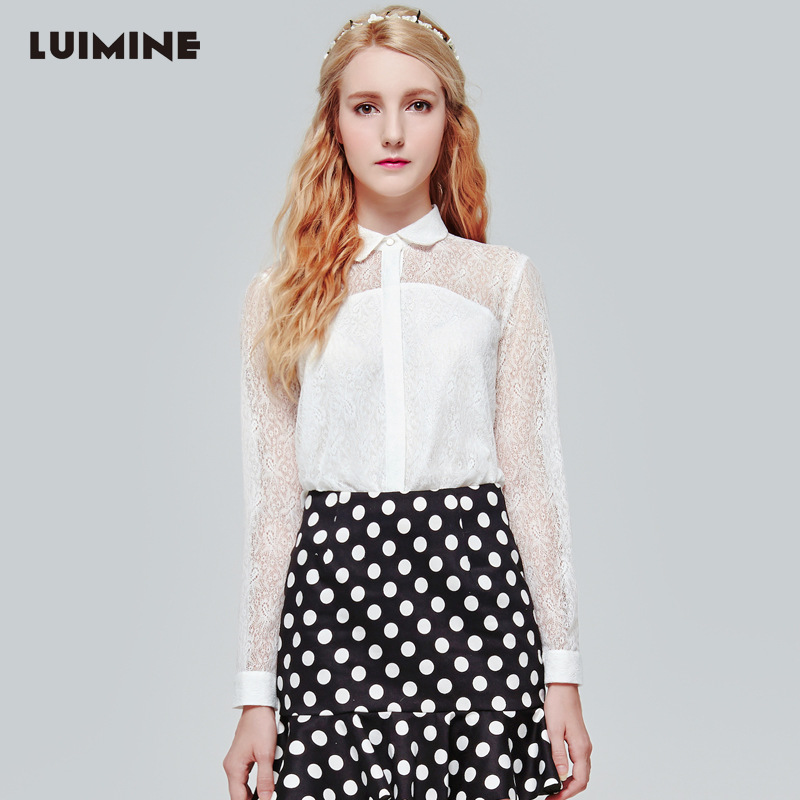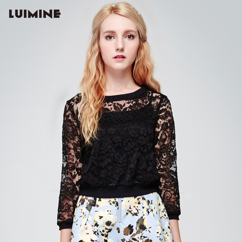 2015秋裝新款韓版女裝七分袖黑色鏤空罩衫短款蕾絲上衣蕾絲衫 /
