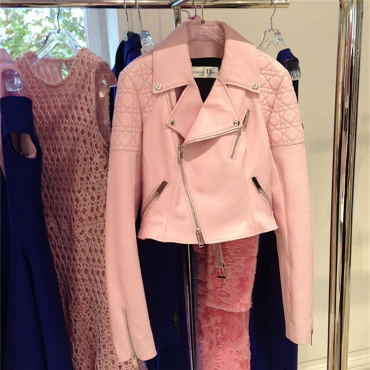 2015春秋新款機(jī)車皮夾克水粉色綿羊皮短款修身海寧真皮皮衣女外套 /