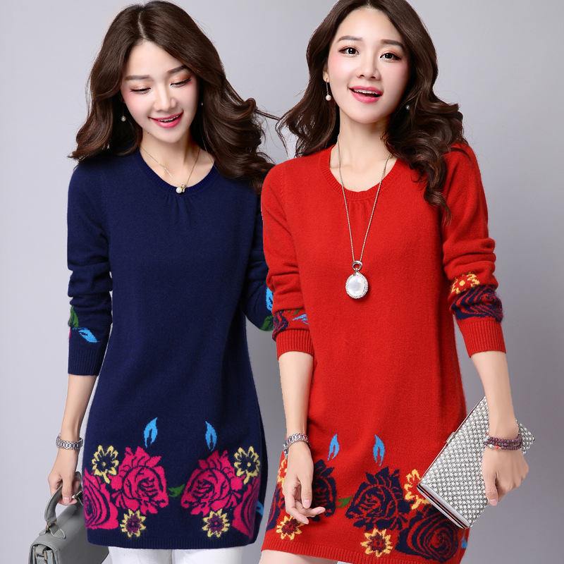 產(chǎn)地貨源秋冬季時尚圓領(lǐng)印花貂絨衫女式中長款百搭顯瘦寬松毛衣 /