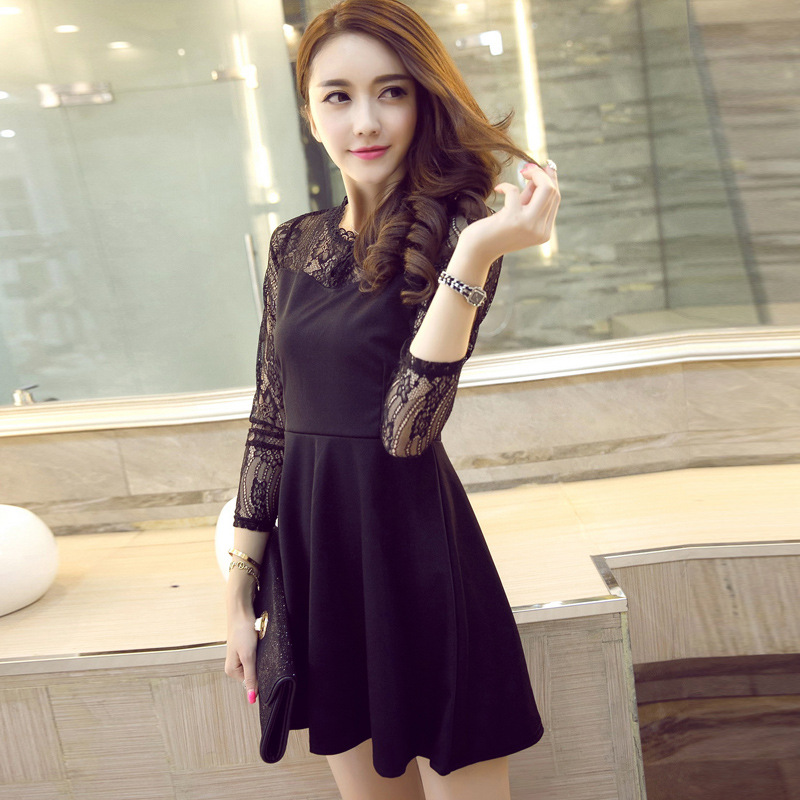 2016春裝韓版新款時(shí)尚百搭修身顯瘦長(zhǎng)袖大擺蕾絲拼接連衣裙 /