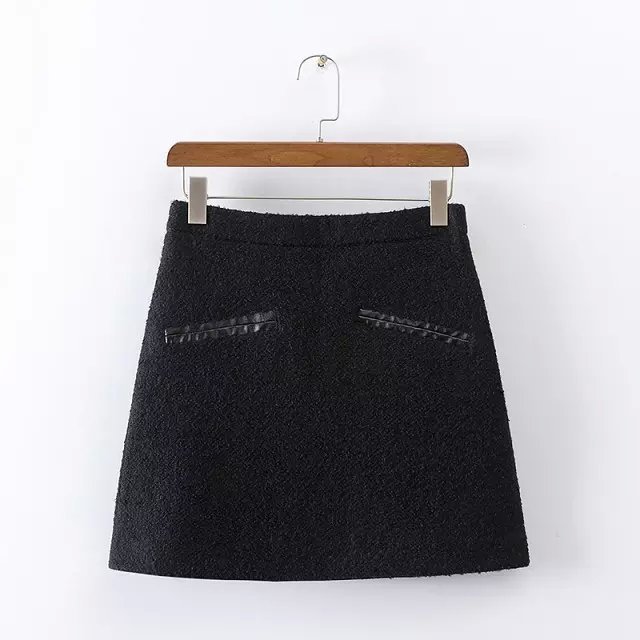 2015秋冬時尚新款裝飾皮革嵌袋 小A字 顯瘦高腰毛呢半身裙短裙 /