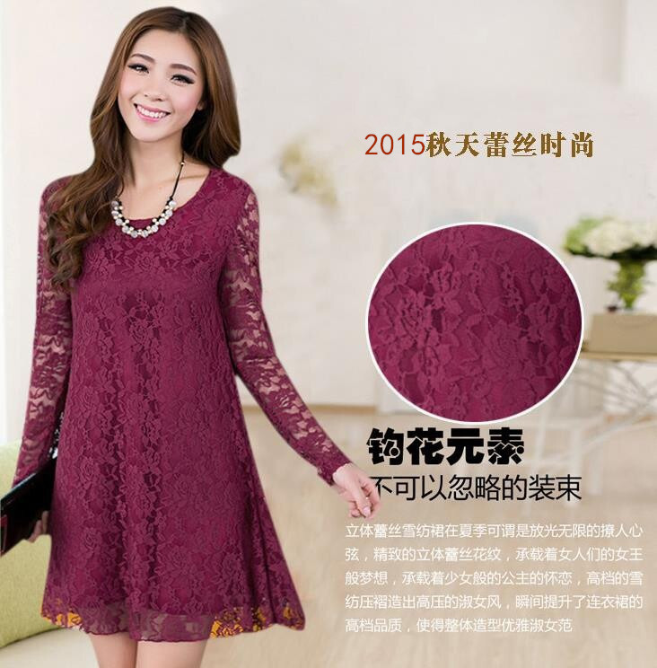 2015秋季新品韓版大碼長袖蕾絲鉤花中長款連衣裙 女裝顯瘦打底裙 /