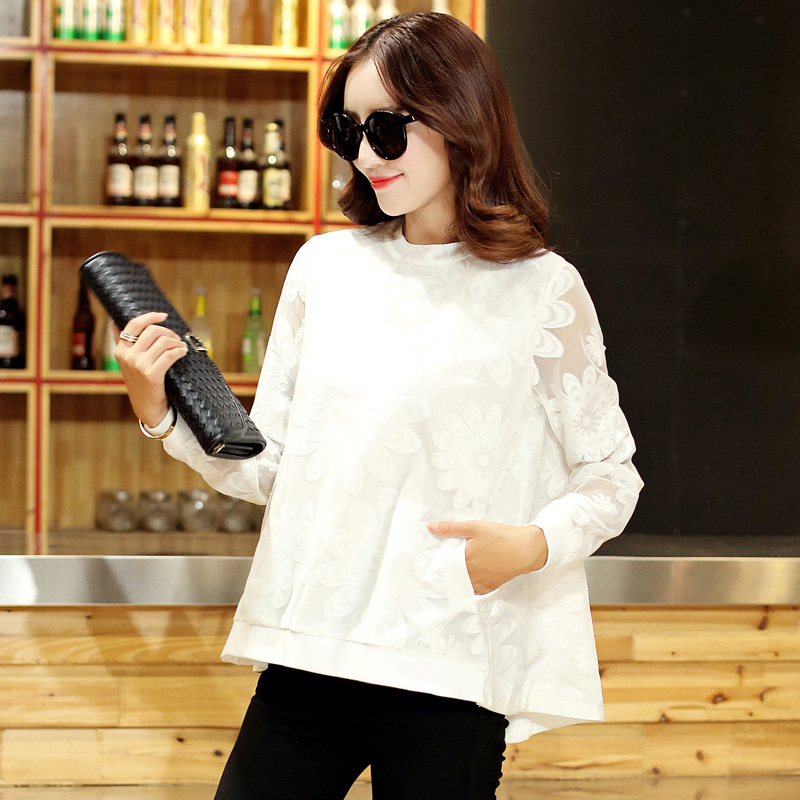 實拍秋長袖蕾絲上衣圓領大碼女裝韓系加肥加大大擺寬松外套 /