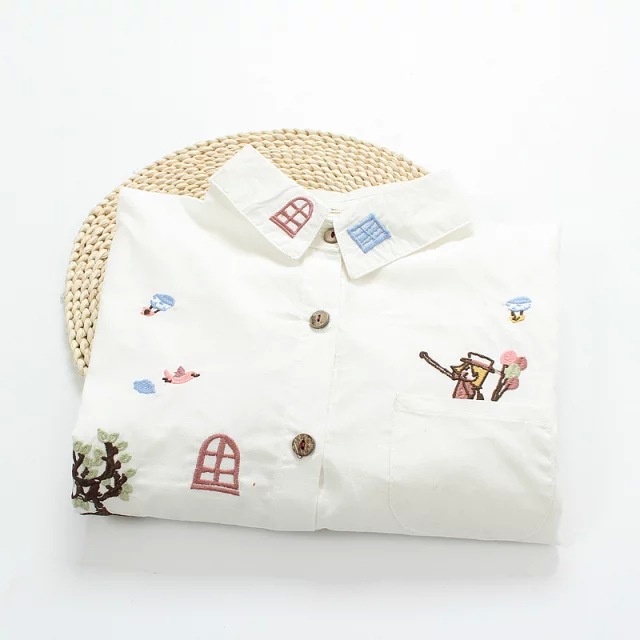 秋季新款小清新 卡通鳥籠動(dòng)物刺繡白色襯衫純棉襯衣女 /