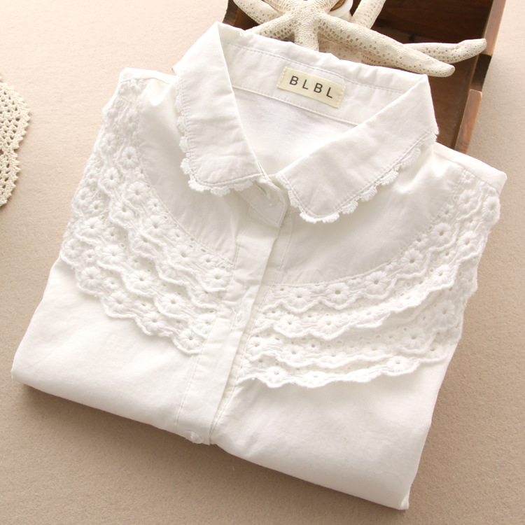 2015秋季新款蕾絲花邊領(lǐng)襯衣女長袖純棉韓版修身襯衣白色打底襯衫 /