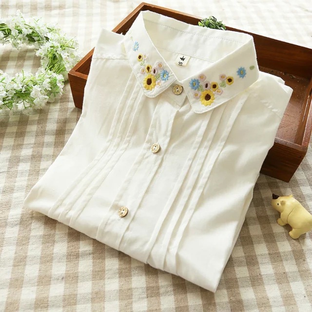 秋款新款文藝小清新 刺繡小菊花翻領(lǐng)長袖打底襯衫女襯衣1018 /