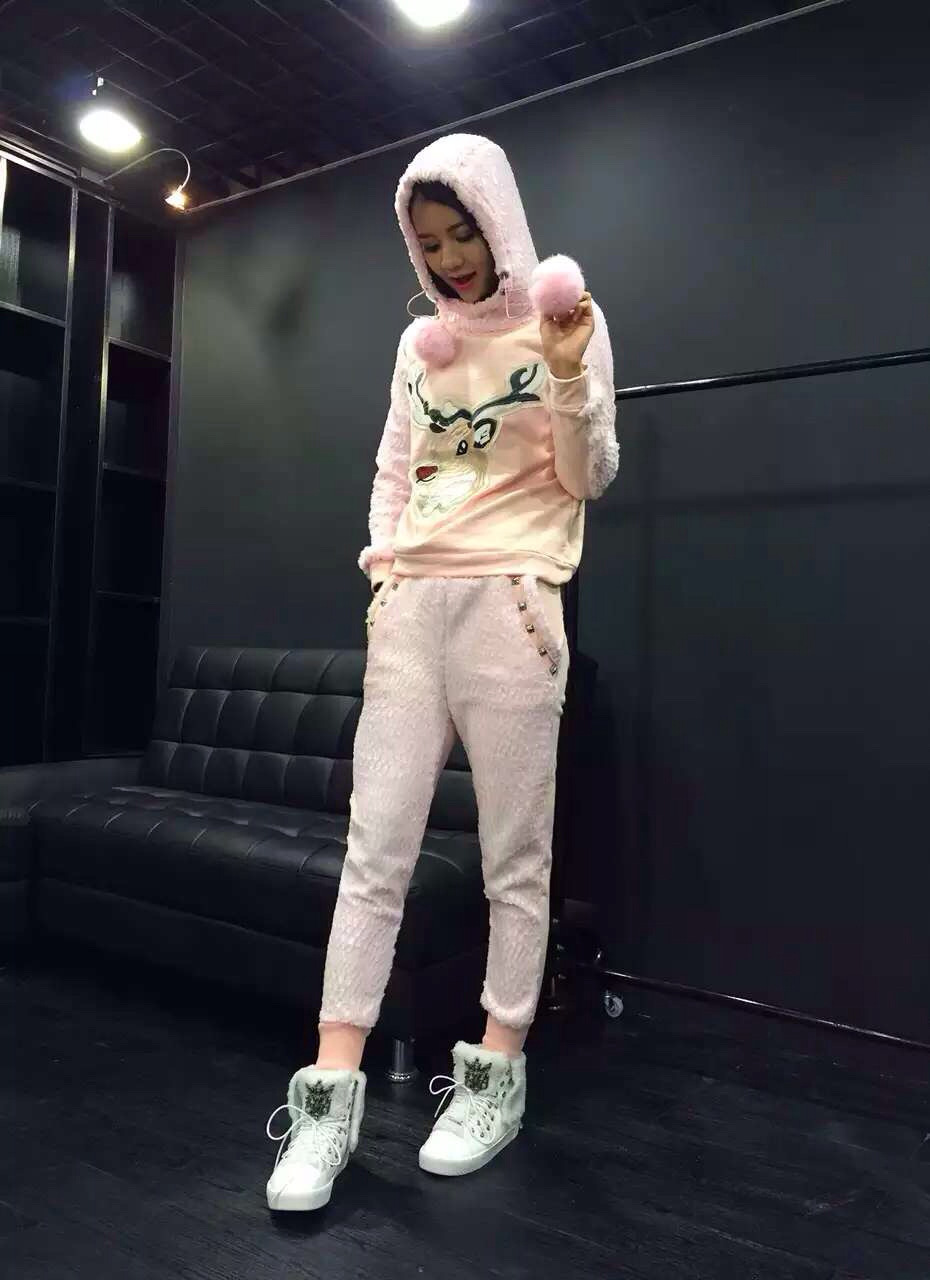歐洲站冬裝新款時尚卡通小鹿兔毛珠片休閑連帽衛(wèi)衣 褲子套裝女 /