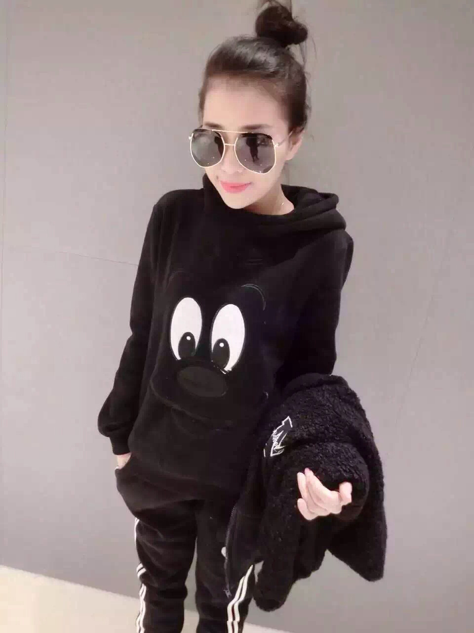 歐洲站15冬裝新款時尚韓版卡通加棉加絨加厚休閑連帽衛(wèi)衣套裝女 /