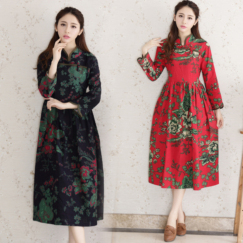 實(shí)拍2015秋冬新款加厚民族風(fēng)夾棉棉麻袍子印花連衣裙女 /