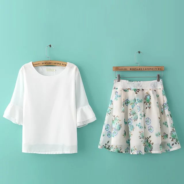 6417 春夏新款 淑女系清晰女裝雪紡短袖T恤上衣+印花半身裙套裝女 /