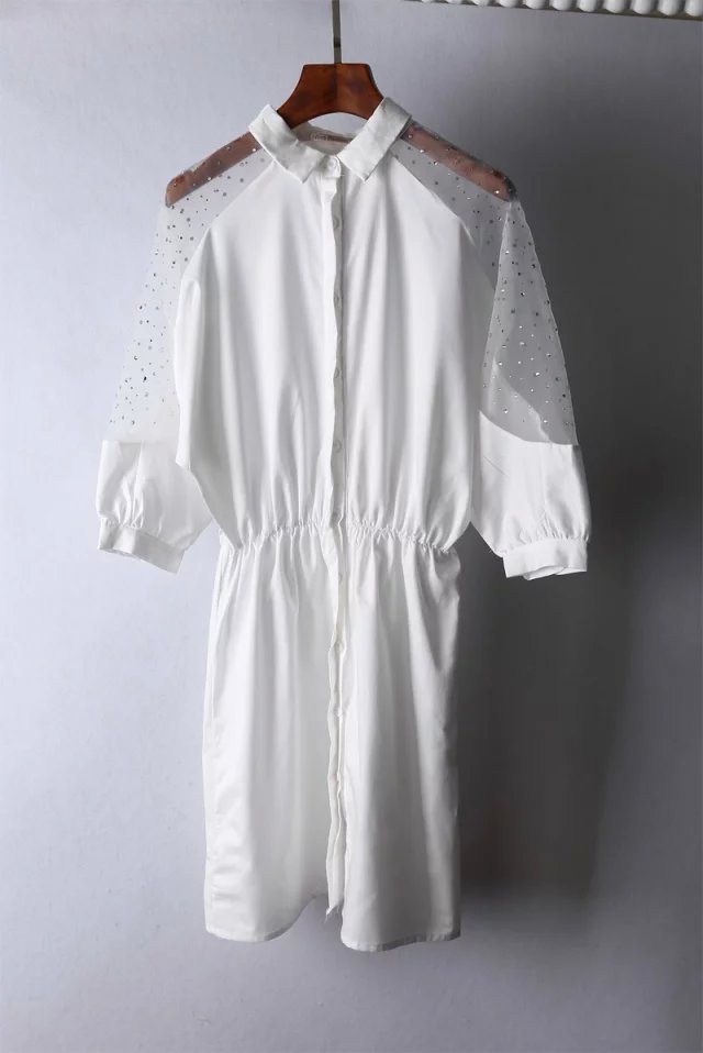 爆款 2015春夏新款 歐美女裝性感透視歐根紗襯衫燙鉆修身連衣裙 /