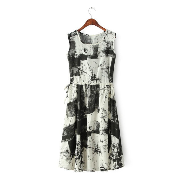 6814 夏季新款 歐美風女裝潑墨印花復古棉麻抽繩無袖大擺連衣裙 /