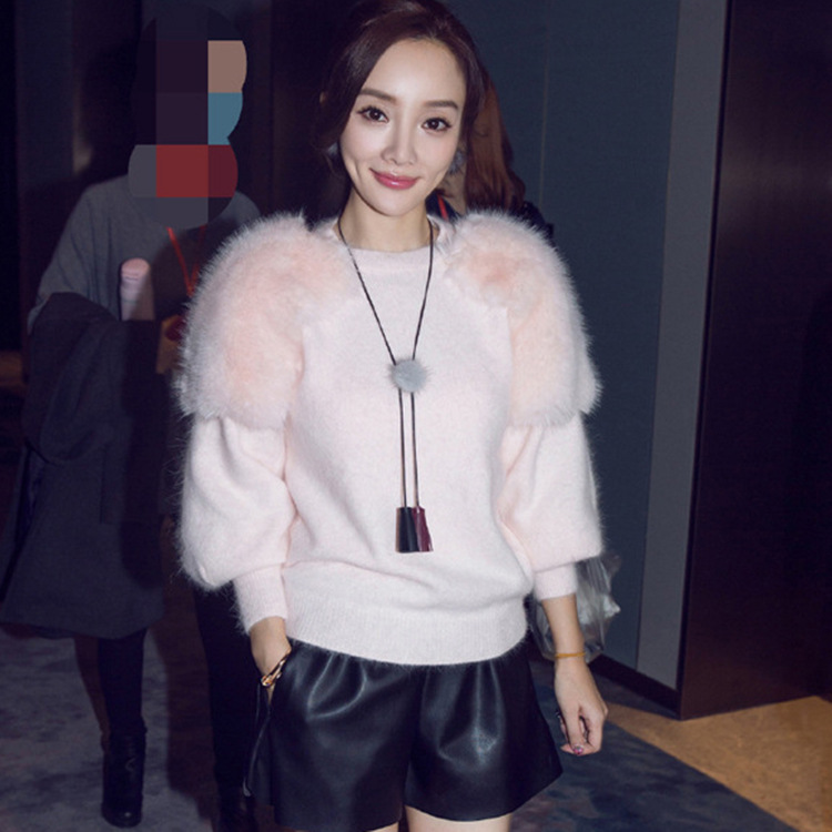 女式休閑套裝長袖兔絨毛衣皮短褲兩件套 冬裝新款時尚褲套裝 /