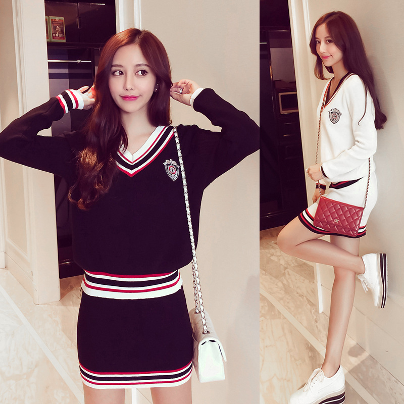 學(xué)院風(fēng)時(shí)尚顯瘦V領(lǐng)針織上衣+短裙套裝 /