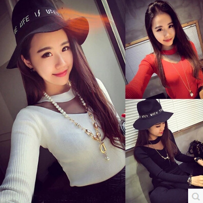 冬季新品歐美范網(wǎng)紗拼接小性感透視修身百搭打底針織衫 /