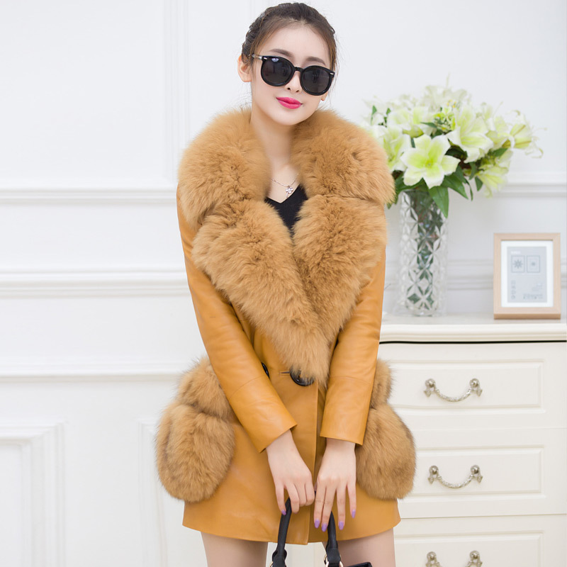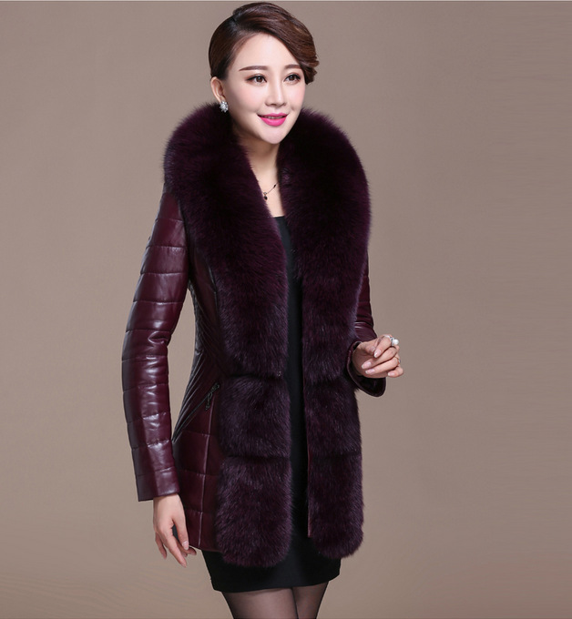 2015新款海寧仿真皮衣綿羊皮真皮羽絨服女中長款修身大仿狐貍毛領(lǐng) /