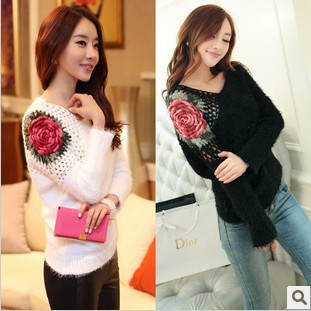 外貿(mào)新品大牌范肩膀鏤空手工鉤花玫瑰花牡丹蝙蝠袖長毛毛衣CMTV21 /