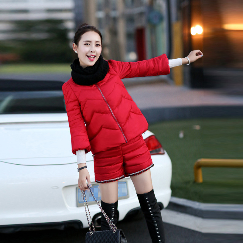 2015冬季新款A(yù)字短款棉衣女韓版時尚羽絨棉服兩件套加棉短褲套裝 /