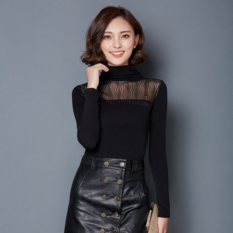 (實(shí)拍)2015秋冬新款韓版加絨大碼修身蕾絲網(wǎng)紗打底衫潮 /