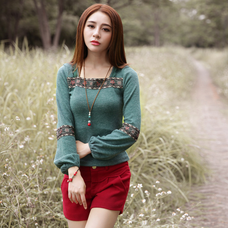 實(shí)拍 2015秋裝新款女裝復(fù)古繡花修身燈籠長(zhǎng)袖針織衫上衣 清靈 /