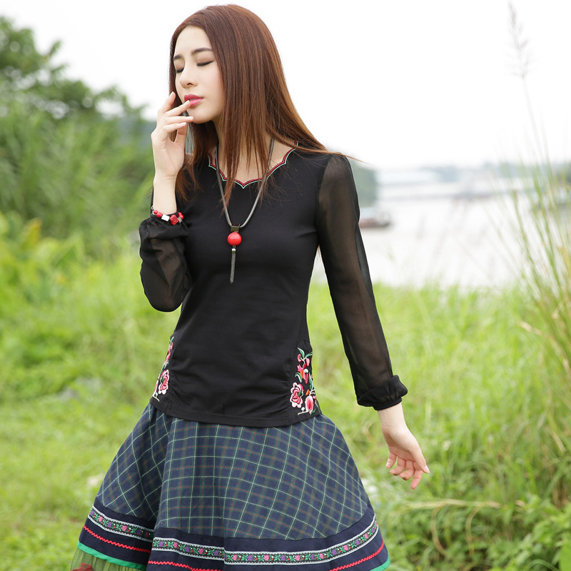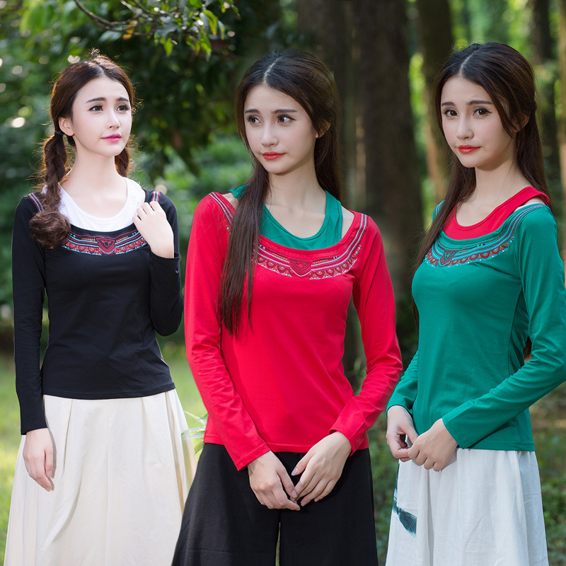 2015秋款民族風(fēng)刺繡長(zhǎng)袖假兩件T恤 /