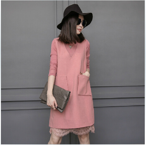 歐洲站秋裝歐貨蕾絲打底衫兩件套時尚長袖秋冬毛呢連衣裙女潮 /