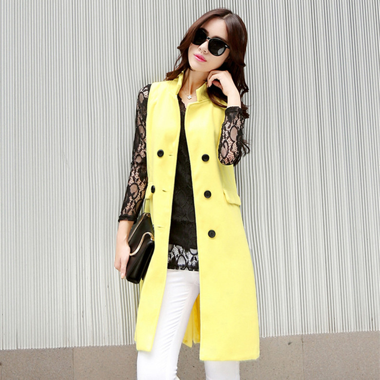 【直銷代發(fā)】2015克拉戀人迪麗熱巴高雯同款黃色雙排扣風衣長馬甲 /