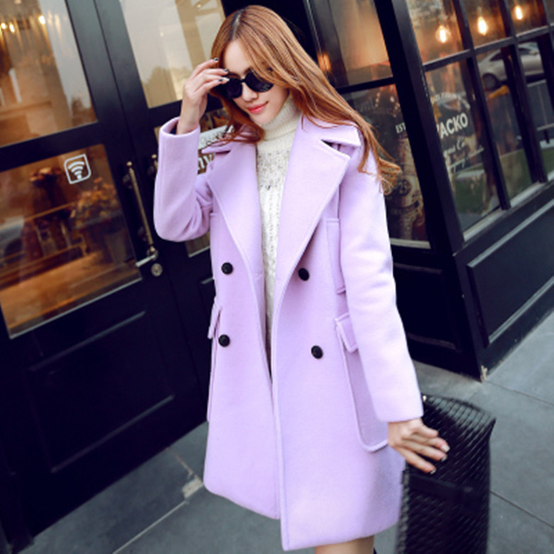 【直銷代發(fā)】2015秋冬新款女紫色加厚中長款西裝領寬松大衣外套 /