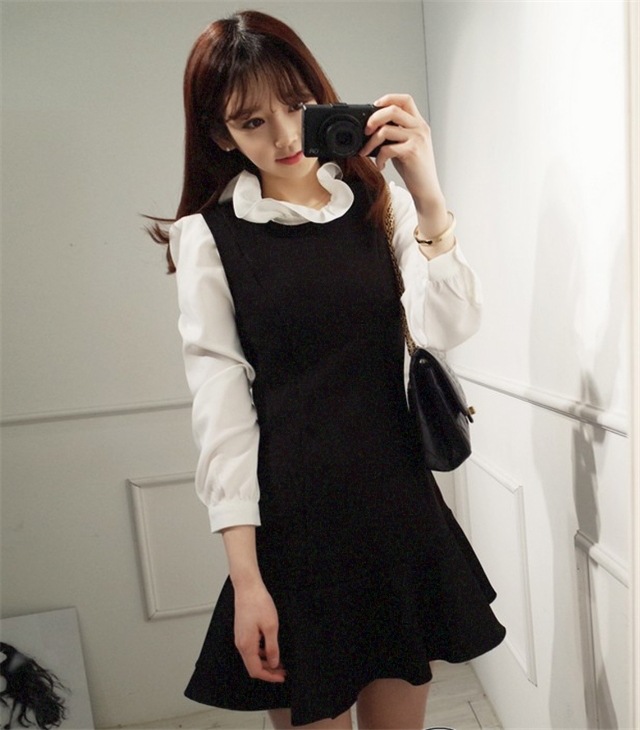 2015韓版秋季娃娃領(lǐng)長袖襯衫+無袖背心裙兩件套 小清新荷葉邊連衣 /