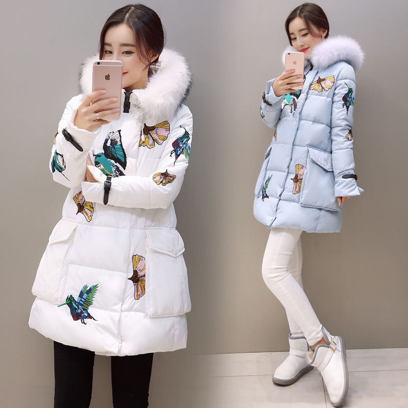 冬裝新款韓版白鴨絨A字版繡花羽絨棉服女中長款狐貍毛領 /
