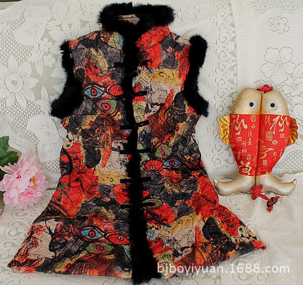 帛衣苑 民族風(fēng)兔毛整體繡壓棉中長款馬甲 /