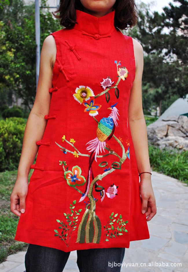 中式繡花 鳳凰牡丹斜襟盤扣砍 無袖旗袍馬夾 /