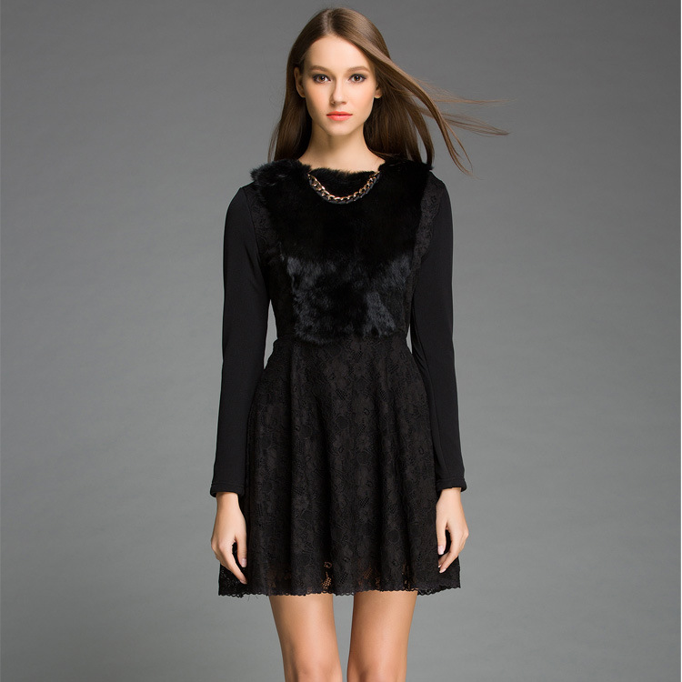 秋冬新款歐洲站時尚品牌大碼女裝蕾絲兔毛拼接加絨保暖打底連衣裙 /